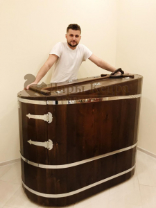 Дома стоит такая фитобочка уже полтора года, пользуемся каждый день! Очень нравится, бочку покрыли в бесцветный лак, т.к. спальня у меня полностью в таком цвете под дерево. Смотрится очень интересно и необычно! Парогенератор к бочке брали самый дорогой, поэтому не жалуюсь, всё работает, как по часам: можно поставить отсрочку на таймере или наоборот задать время процедуры. Рекомендую работать с компанией Дары Кедра и своим знакомым:)